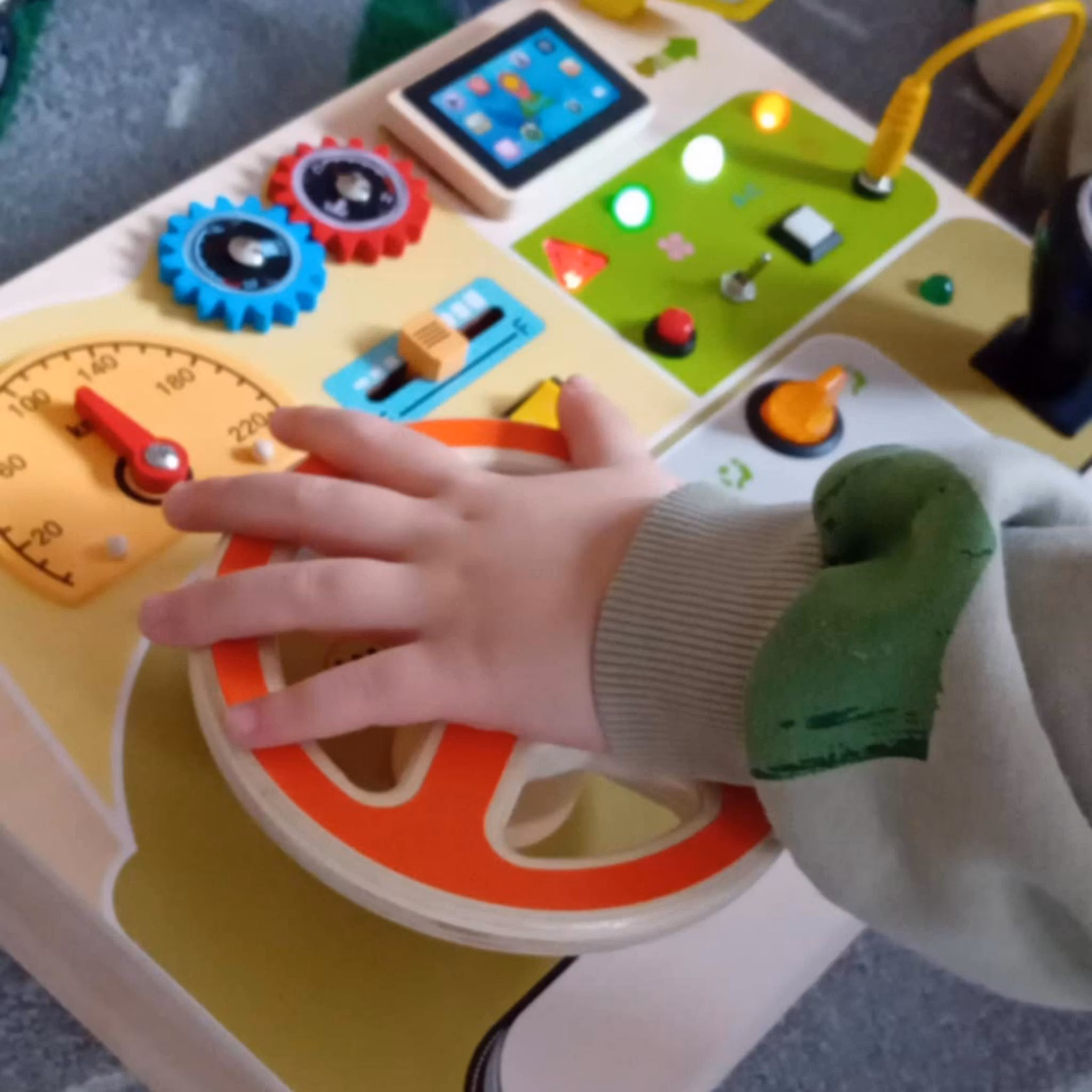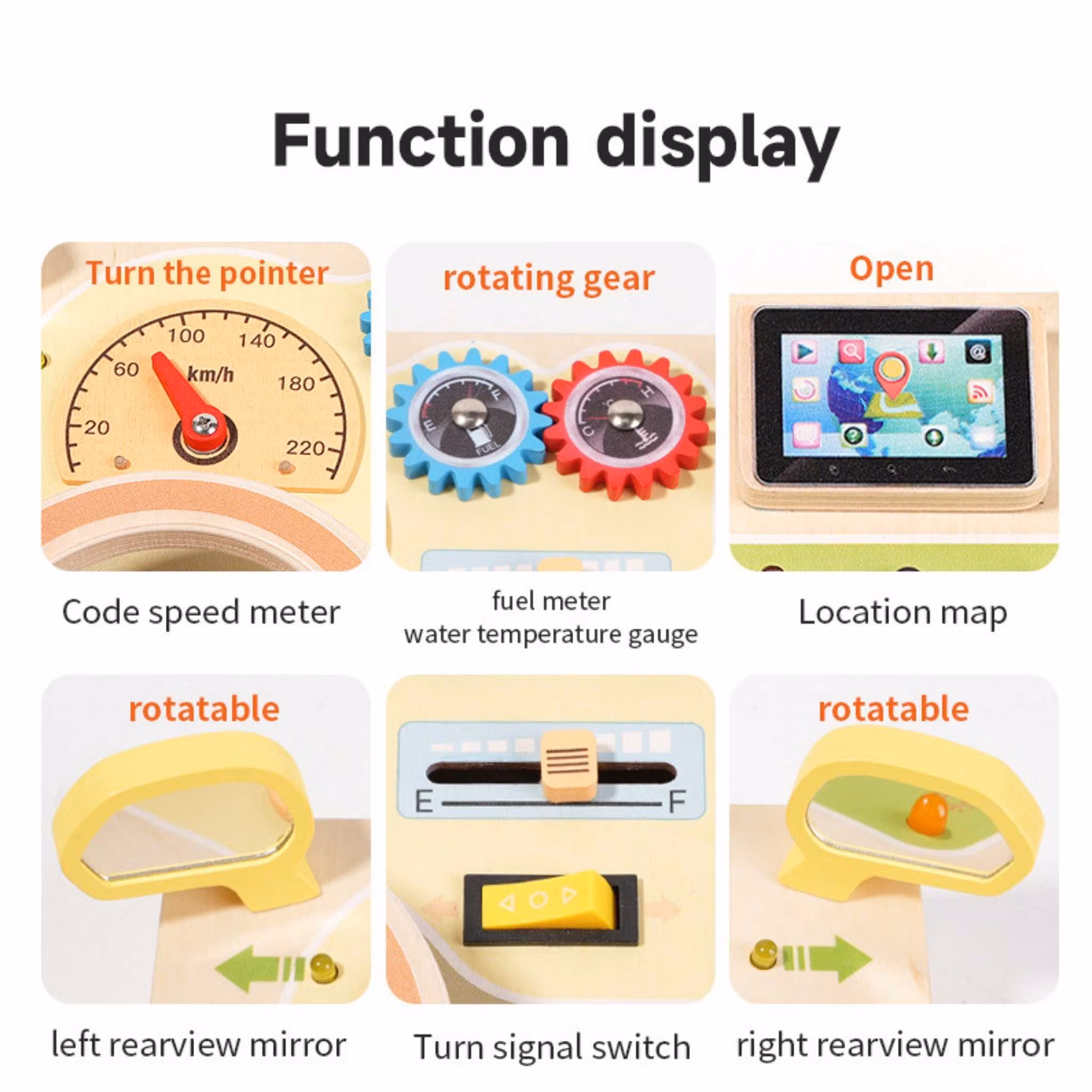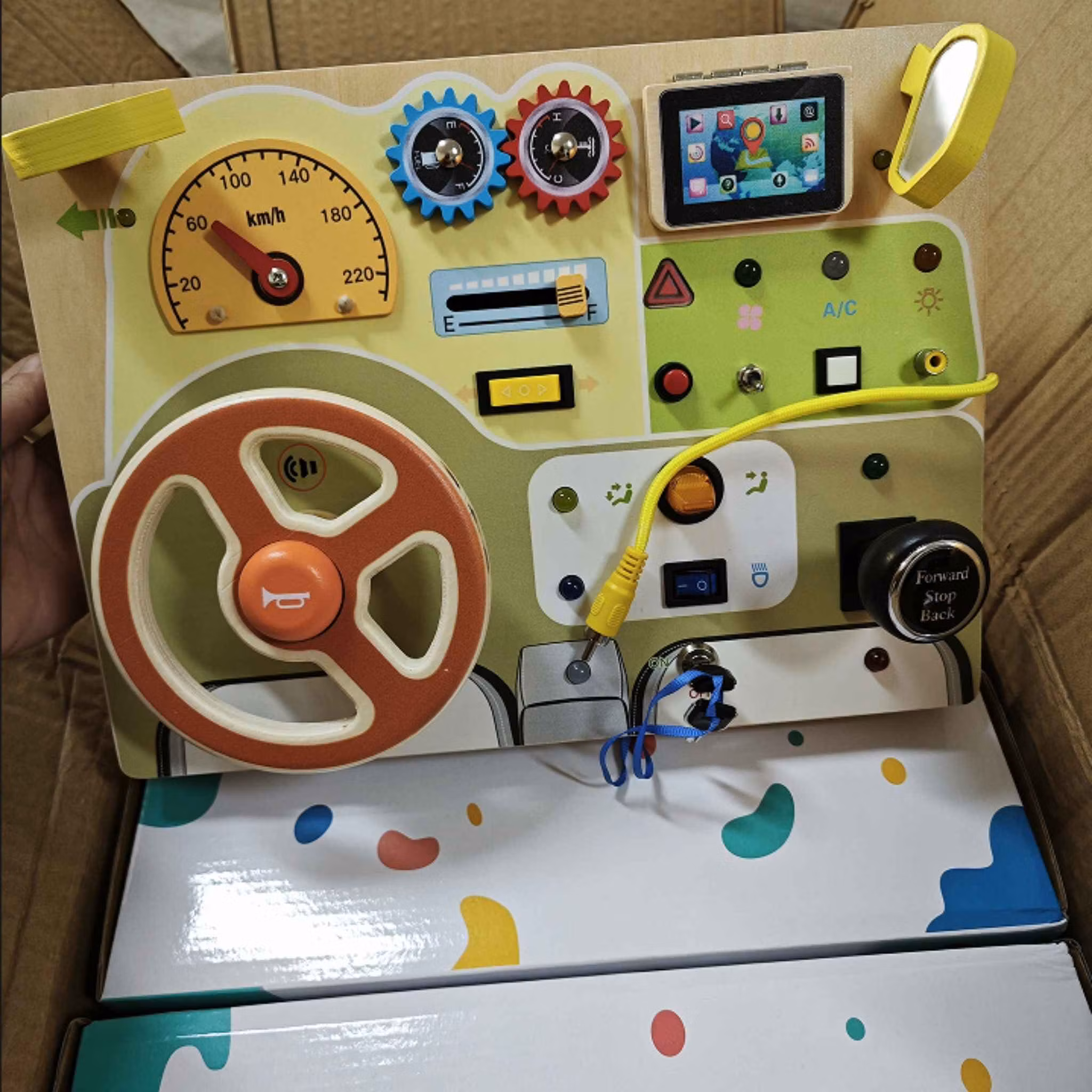 Denna Montessori busy board i trä förvandlar en instrumentpanel till en lärorik och rolig lekupplevelse – med ratt, tändningslås, blinkers, ljus och ljud. Perfekt för nyfikna små händer som vill leka, lära och utvecklas.