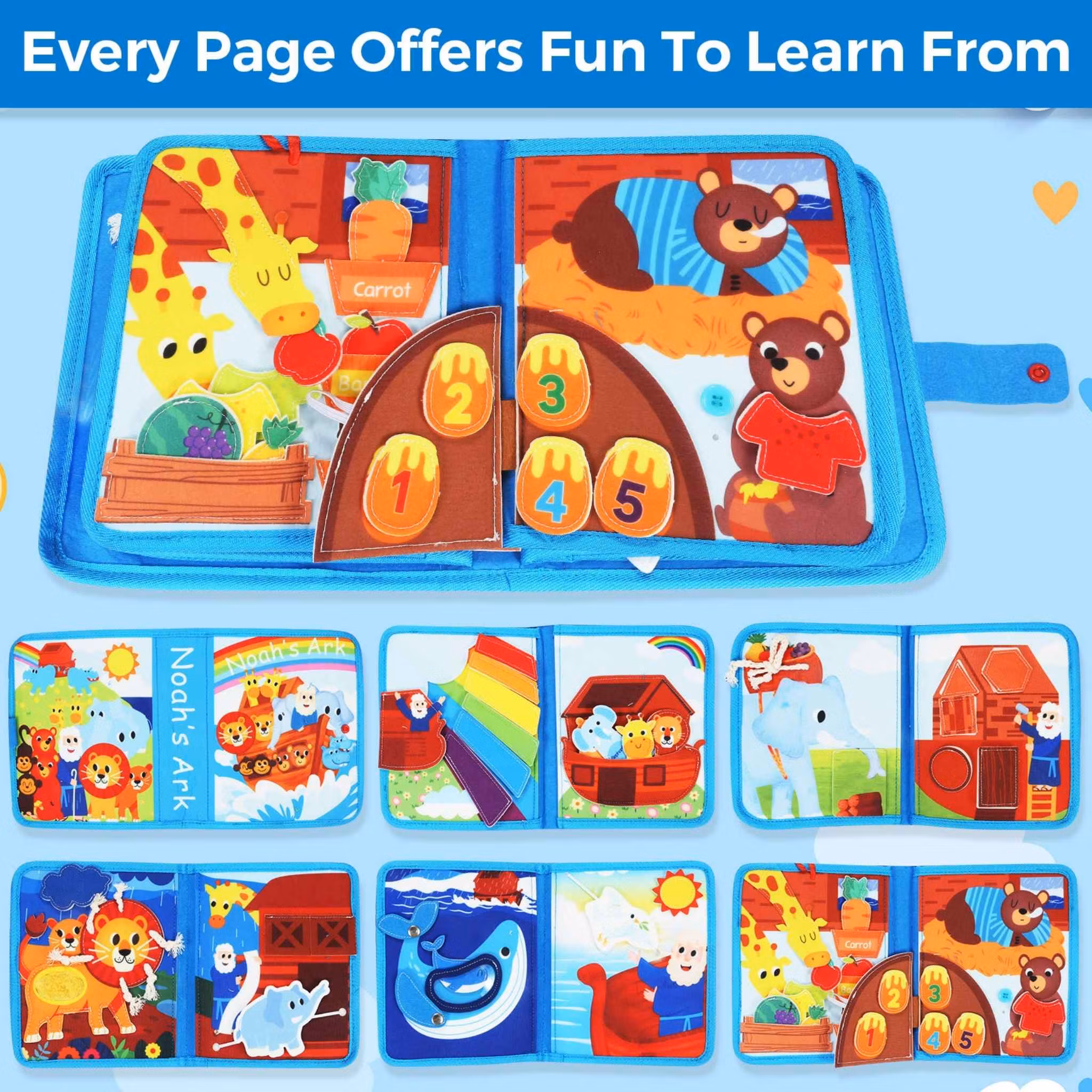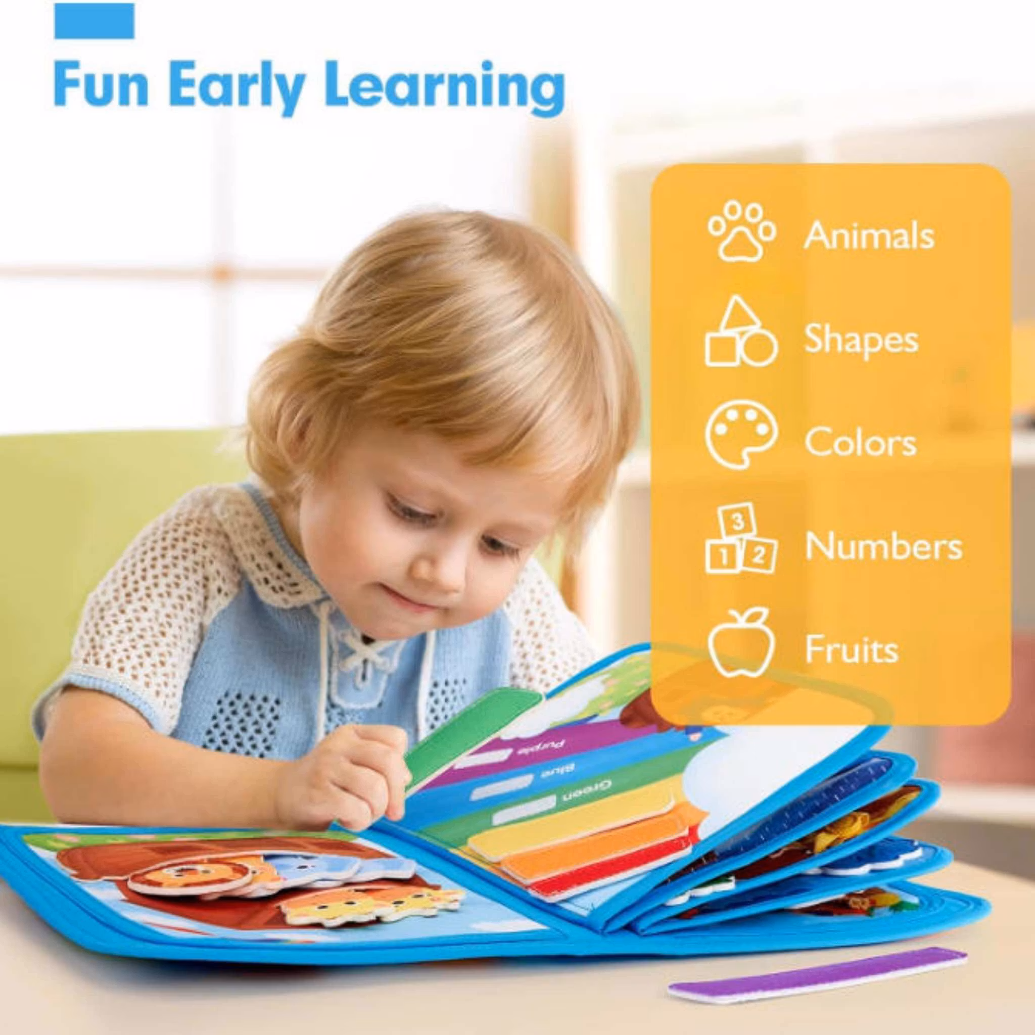 Denna mjuka Montessori quiet book är fylld med 20 interaktiva aktiviteter som stimulerar finmotorik, logiskt tänkande och tidig inlärning – perfekt för barn 1–3 år.